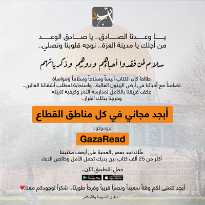 ٢: في ظل الظروف الأليمة التي تجري في قطاع غزة، دشّن تطبيق «أبجد» للقراءة الإلكترونية مبادرة لتوفير الكتب مجاناً داخل القطاع لمدة ثلاثة أشهر.