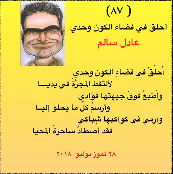 الأحد ٢٩ تموز (يوليو) ٢٠١٨ بقلم عادل سالم أحلق في فضاء الكون وحدي أحلق في فضاء الكون وحدي لألتقط المجرة في يديا وأطبع فوق جبهتها فؤادي وأرسم كل ما يحلو إليا وأرمي في كواكبها شِباكي فقد أصطاد ساحرة المحيا