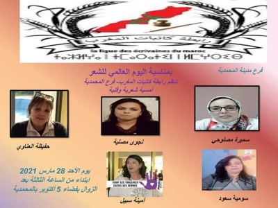 بمناسبة اليوم العالمي للشعر الذي يصادف 21 مارس من كل عام، نظمت رابطة كاتبات المغرب- فرع المحمدية أمسية شعرية فنية يوم الأحد 28 مارس بفضاء 5 أكتوبر بالمحمدية على وقع الإبداع النسوي في مجال الشعر الفصيح والشعبي (الزجل) والفن التشكيلي من خلال عرض لوحات للفنانة التشكيلية عضو المكتب المحلي زهور العزيزي، حيث شارك في الأمسية كل من الشاعرات المبدعات سميرة مصلوحي، نجوى مصلية، أمينة سبيل، حفيظة العناوي، سومية سعود، زهور العزيزي، إضافة إلى الناقد والمبدع عزيز العرباوي.