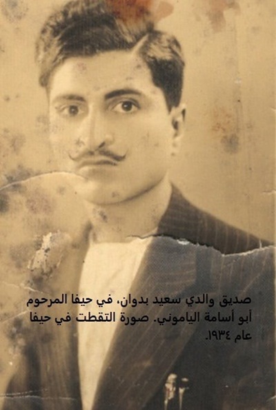 وخالد شنكل الصفدي الأصل وصاحب محل الحلاقة في حارة الكنائس. وحسين ونايف أبو العردات. وأبو شحادة ستيتية. وحسين عبود السكافي أبو محمد صاحب محل (درازة) وتصليح الأحذية في محل يقع في بناية العجمي. وأبو سميح مسعود من قرية (بُرقة) قضاء نابلس والذي كان يقيم في حيفا، وبالجوار من منزلنا، وقد رحل يوم النكبة الى قريته (بُرقة). وبهجت البيلاني زوج عمتي (آمنة بدوان) اللبناني المُقيم في حيفا، والذي كان يمتلك محلاً في حيفا لصناعة الأحذية الجلدية الأصلية من الجلد الطبيعي، والذي خرج من فلسطين عام النكبة باتجاه مدينة صيدا حيث مدينته وعائلته الكبرى علماً أن جذوره تعود به الى قرية العديسة اللبنانية جنوب مدينة صور والملاصقة لفلسطين. والمرحوم أحمد طاهر أبو عبيد (أبو أسامة الياموني)، ورغم لقبه (الياموني) الذي اشتهر به نسبة لبلدة (اليامون) قضاء جنين، إلاّ أنه من بلدة (عرابة) قضاء جنين أيضاً القريبة من بلدة (اليامون) ... وكان المرحوم أبو أسامة الياموني الصديق المخلص لوالدي، وكما يقولون الصديق من "الروح للروح" وقد أهداه صورته عام 1933 وهو في ريعان الشباب، ومازلنا نحتفظ بها، حيث كتب لوالدي خلف الصورة البيتين التاليين: