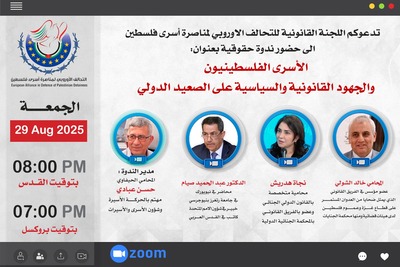 نظّم التحالف الأوروبي لمناصرة أسرى فلسطين، ندوة حواريّة عبر تطبيق زووم، تحت عنوان "الأسرى الفلسطينيون والجهود القانونية والسياسية على الصعيد الدولي"، وذلك يوم الجمعة الموافق: 29.08.2025. وشارك فيها وحضرها نخبة من الحقوقيّين والمهتمين بقضايا الأسرى من فلسطين والوطن العربي والدول الأوروبية. وتولى إدارتها المحامي الحيفاوي حسن عبادي (عضو اللجنة القانونيّة للتحالف).