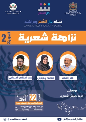 تنظم دار الشعر بمراكش، يوم السبت 22 يونيو الجاري على الساعة السادسة والنصف مساء، فعاليات الدورة الثانية من برنامجها "نزاهة" شعرية، في استدعاء لأحد التقاليد الاجتماعية الراسخة في مدينة مراكش. ويحتضن دوار أكادير الغاشي، قبيلة امتوكة، التابع لجماعة إشمرارن شيشاوة، الانطلاقة الفعلية لهذه الفعاليات والتي تشهد تقديم قراءات شعرية للشعراء: عبدالعظيم الحيداوي، فاطمة بلعروبي، وعمر برغوت، فيما تحيي الحفل الفني، لنزاهة شعرية، فرقة أحواش اشمرارن.