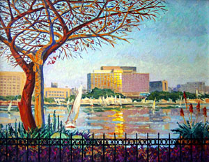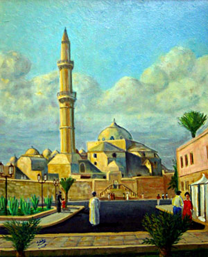 فجوامع القاهرة ومآذنها والاهرام والنصب في وسط الساحات العامه كتمثال (سعد زغلول) ومراكب اسون والحواري القديمة ونهر النيل الضاج بالحركة والحياة من حوله وغيرها الكثير من الاماكن التي تشكل عوالم المدينه استلهمها الفنان كحلم عاشه، فقد لخصت لوحاته كل الزوايا التي لا تلتفت اليها الى عين الفنان المتمرس المستند الى وعي وادراك عالي للاشياء العاديه واليومية برؤيه مفعمه بالحب ومعرفة قيمة الارث المعماري والتاريخي وابراز قيمته المختزنة عبر عين المعماري العارف لقيمة المكان.