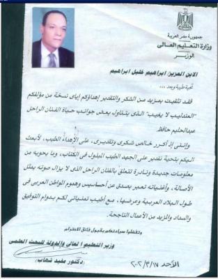 تلقيت بحزن عميق وبكاء قلبي نبأ وفاة الأستاذ الدكتور مفيد شهاب الدين صباح الأحد 15 فبراير 2026 فهو صاحب مكانة كبيرة في قلبي وقد تعاملت معه عن قرب ولايمكن أن أنسى عندما أصدرت كتابي العندليب لايغيب تقابلت معه في مكتبه بوزارة التعليم العالي والدولة للبحث العلمي يوم الخميس 14 مارس 2002 وأهديته نسخة من الكتاب وشكرته على دوره في مباحثات طابا وأثناء حديثي مع سيادته قال: أنت خريج حقوق يا أستاذ إبراهيم؟ فقلت له: أنا خريج كلية التجارة شعبة إدارة الإعلام فقال: ياريت شباب مصر مثلك ثم قال: مكتبي مفتوح لك واتصل بي واعتبرني شقيقك الأكبر أو الوالد فشكرته وقبل أن أنصرف قال: أنت كاتب عن فنان جميل وسوف أقرأ الكتاب وواصل كتاباتك فموهبتك متفردة ومتميزة.. ثم انصرفت.