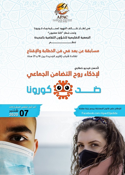 في إطار تكاثف الجهود الرامية إلى محاربة وباء كورونا، وتنزيلا لمضامين الخطاب الملكي السامي بمناسبة ثورة الملك والشعب، تنظم الجمعية الإقليمية للشؤون الثقافية بالجديدة مسابقة عن بعد في فن الخطابة والاقناع لفائدة شباب إقليم الجديدة المتراوحة أعمارهم بين 16 و21 سنة لأحسن فيديو خطابي تحسيسي يرمي إلى إذكاء روح التضامن بين أفراد المجتمع لاسيما الشباب ضد وباء كورونا.