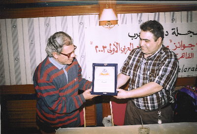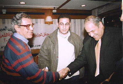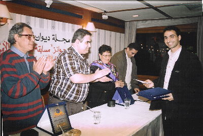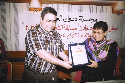 فى أحضان نيل القاهرة العظيم، احتفلت أسرة تحرير مجلة "ديوان العرب" بالفائزين والمشاركين فى مسابقة الشعر العربى الأولى للعام 2003. حضر الاحتفال عضوا لجنة التحكيم المصريان السيدة فريدة النقاش والشاعر حلمي سالم ولم يتمكن العضو الثالث الأستاذ إسماعيل محمود المقيم في الإمارات من المشاركة. كما شارك فى الاحتفال الشاعر أحمد محجوب الفائز بالجائزة الأولى مناصفة مع الشاعر الأردني سيف محاسنة والشاعر الليبي صالح أحمد محمد الرضا الفائز بالجائزة الثانية حيث حضر خصيصا من ليبيا للمشاركة فى الاحتفال. وبسبب وعكة صحية مفاجئة ألمت بها، اعتذرت عن الحضور الشاعرة المصرية لمياء ياسين الفائزة بالمركز الثالث مناصفة مع الشاعرة الفلسطينية أمل إسماعيل، وأنابت عنها شقيقتها د. فاطمة أحمد وزوج شقيقتها الأستاذ أسامة مصطفى لتسلم الجائزة. كما شارك فى الاحتفال الكاتب الفلسطينى الكبير الأستاذ عبد القادر ياسين عضو أسرة تحرير مجلة فلسطين حيث يقيم في مصر. كما شارك فى الاحتفال عدد من الكتاب والشعراء والصحفيين والفنانين المصريين على رأسهم الفنان الكبير محمد ناجى، والكاتب الصحفى الدكتور أحمد الخميسى، والكاتب والشاعر الأستاذ ممدوح الشيخ، والكاتب الموهوب سعيد حجاج. ومن الصحفيين شارك الاستاذ عماد فؤاد محرر بجريدة الأهالى المصرية، والأستاذ منصور عبد الغنى مراسل جريدة أخبار العرب الإماراتية، والصحفى أشرف أنور بجريدة الأسبوع، وطارق الطاهر من جريدة أخبار الأدب، وعمرو رضا من جريدة الجمهورية. كما شارك فى الاحتفال المحامى حلمى الراوى الناشط فى مجال حقوق الإنسان. والباحثة الشابة هبة حسني إمام، إضافة لعدد كبير من الضيوف والأصدقاء.