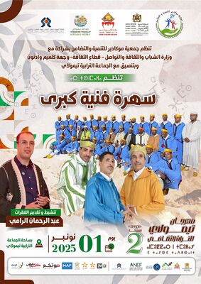 تنظم جمعية موكادير للتنمية والتضامن بدعم من المديرية الجهوية لوزارة الشباب والثقافة والتواصل ( قطاع الثقافة) وجهة كلميم وادنون، وبتعاون مع مجلس جماعة تيمولاي والمديرية الإقليمية للتربية الوطنية والتعليم الأولي بكلميم واللجنة الجهوية لحقوق الإنسان كلميم وادنون، فعاليات الدورة الثانية من مهرجان تيمولاي للتراث الثقافي، وذلك في الفترة ما بين 31 أكتوبر و 10 و02 نونبر 2025 بجماعة تيمولاي.
