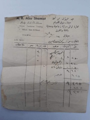 (الصورة، فاتورة رسمية شراء من محل عبد الرؤوف أبو شمط، سوق الشوام، والخاص بتجارة الواني المنزلية الزجاجية والمعدنية، والمؤرخة 13/8/1947. والشاري هو المواطن الفلسطيني محمد يوسف عيسى الذي لجأ بعد النكبة الى دمشق، وقد حمل مجموعات فواتير الشراء التي سددها في فلسطين قبل اللجوء)