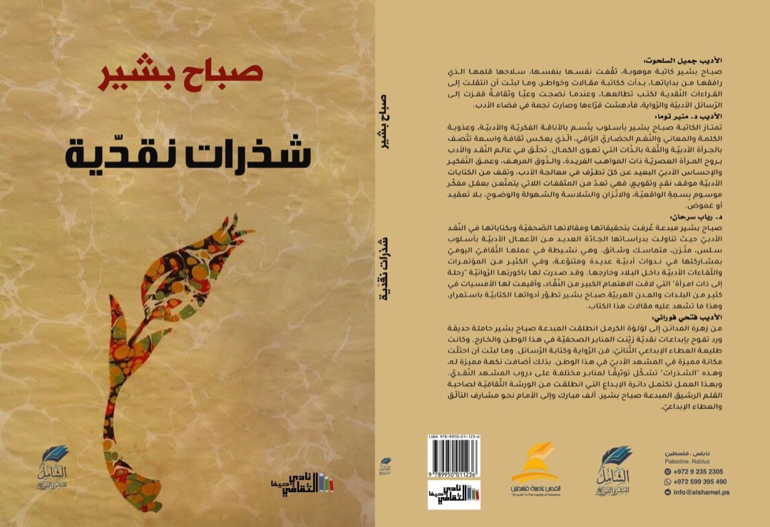عن دار الشّامل للنّشر والتّوزيع في نابلس، وبالتّعاون مع نادي حيفا الثقافيّ، صدر كتاب "شذرات نقديّة" للأديبة الفلسطينيّة صباح بشير، وهو يقع في (327) صفحة من القطع الكبير، وقد أهدته بشير إلى والدتها، وإلى روح والدها، تقديرا لفضلهما ودعمهما لها في مسيرتها الثقافيّة.
