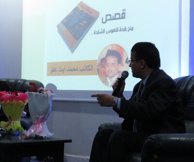 كان الجدار المائلُ قد صيغت عليه لوحة لمتاهات بحجم الظل، موشح بلون أحمر قان، وأسود قاتم، مدعوم بطقوس البؤس...نظرَ إلى الأعلى كانت بشائرُ الضياء الشَّديدِ تُلَوِّحُ من الأفق، وعلى الجدارِ لوحةٌ كُتِب عليها"جميعنا سجناء"،