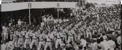 ويشاهد واقفا على المنصة شخصيات قطاع غزة. والمرحوم احمد الشقيري مؤسس منظمة التحرير الفلسطينية. واللواء وجيه طلعت المدني القائد العام للجيش عند قيامه.