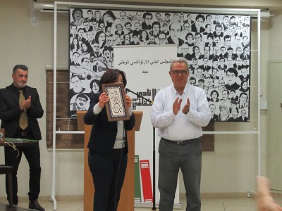 وممثلا عن المجلس الملي الوطني الأرثوذكسي - السيد جريس خوري وعن نادي حيفا الثقافي - رئيسه المحامي فؤاد نقارة، سلماها درع تكريم لها ولأعضاء الرابطة العرب.