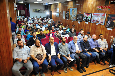 في حين رئيس اتحاد طلبة فلسطين في سورية باسل أبو الهيجا شدد على ضرورة العمل بروح واحدة لبناء مشروع فلسطيني متكامل لمواجهة العدو الصهيوني والانتصار عليه.