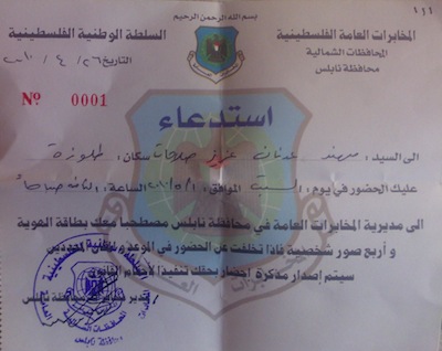 عاودت المخابرات الفلسطينية صباح يوم الإثنين 26 نيسان 2010، بإرسال طلب استدعائي لدائرة المخابرات العامة في مدينة نابلس، ويشتمل طلب الاستدعاء على ضرورة حضوري لدائرة مخابرات نابلس في الثامنة صباحاً من يوم السبت الموافق 1 أيار، وإن تخلفت عن الحضور سيتم اعتقالي.