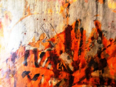 من اللوحة الأولى يشدنا الفنان إلى ثورة كأنها براكين غضب، تمتزج فيها الألوان بقوة، مزيج بين الباردة والحارة، وبين لون الأرض والتراب، مع بروز الأزرق اللازوردي في الزوايا المختلفة. في منتصف اللوحة ينتصب تجريد كأنه جسد إنسان، رأسه كتلة من نار كأنها بركان يتصاعد حتى يشكّل خلفية اللوحة. لا أيادٍ للجسد، وعلى كتفه تجريد آخر يقابله، حيث نرى ضربات قوية بالفرشاة أشبه بتلافيف دماغ أو قطع متناثرة من الفطر البني. في أرجاء اللوحة تجريد لمبانٍ وأشخاص يوحي بأن الجميع يدور في مدارات تيه، وخلفهم انفجار بركاني.