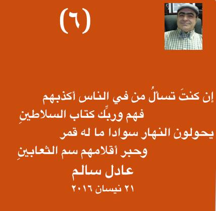 الثلاثاء ٢٦ نيسان (أبريل) ٢٠١٦ بقلم عادل سالم من في الناس أكذبهم إن كنت تسأل: من في الناس أكذبهم؟ فهم وربِّك كتّابُ السلاطينِ يحـــولون النهار ســـــوادا مــا لـــه قـمرٌ وحبرُ أقلامهم سمُّ الثعابينِ