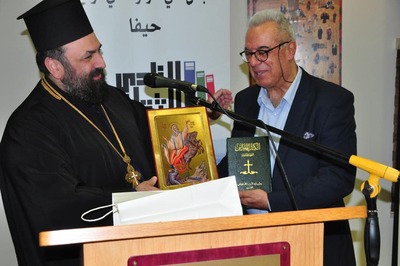 في الختام تحدّث قدس الأرشمندريت أرتيموس، الرّئيس الرّوحي للرعيّة الأرثوذكسيّة في حيفا، عن دور النّادي الثّقافيّ المحوريّ، وتمنى أن يواصل النّادي مسيرته ورحلته الثّقافيّة المثمرة. كما بارك له بهذا الإصدار، وقام بإهداء الأستاذ فؤاد نقّارة نسخة من الكتاب المقدّس “العهد الجديد”، وأيقونة لمار الياس شفيع حيفا.