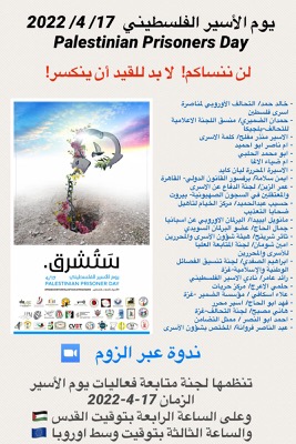 عقدت لجنة متابعة فعاليات يوم الأسير الفلسطيني والتي تضم التحالف الأوروبي لمناصرة أسرى فلسطين ومختلف المؤسسات الداعمة للأسرى في الوطن وبعض الدول الأوروبية ، ندوة عبر تطبيق زوم، خصصها ليوم الأسير الفلسطيني تحت عنوان "لن ننساكم... لا بد للقيد أن ينكسر"، وذلك يوم الأحد الموافق: 17.04.2022. وشارك فيها وحضرها نخبة من النشطاء والمهتمين من فلسطين والوطن العربي والدول الأوروبية. وتولى إدارتها الدكتور خالد حمد المقيم في ألمانيا (منسّق التحالف)، وافتتح الندوة بتحيّة للأسرى الفلسطينيّين في يومهم متحدثا عن النشاطات التي أقرّتها اللجنة، ومنها: إصدار بيان بتسعة لغات، وملصق موحّد للمؤسّسات الداعمة، وفعاليات في الشوارع في مختلف البلدان، ومبادرة "لكلّ أسير قصّة" بالتعاون مع الإعلاميّة هناء فياض (صاحبة مبادرة "الأسير ليس رقمًا"، وألقى كلمة التحالف وأنهاها بشعار الندوة "لن ننساكم... لا بد للقيد أن ينكسر" آملًا بحريّة قريبة لكافّة أسرانا.