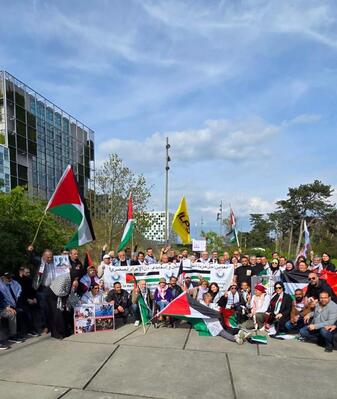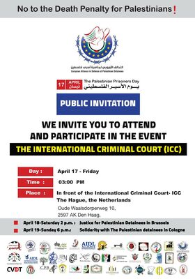 وفي ساعات العصر شاركت بوقفة تظاهرية نظّمها التحالف الأوروبي لمناصرة أسرى فلسطين أمام محكمة الجنائيات الدولية وبحضور متضامنين أوروبيين ونشطاء من هولندا وبلجيكا وألمانيا وفرنسا، تحت عنوان "معاً من أجل حريّة أسرى فلسطين وإسقاط قانون الإعدام العنصري".
